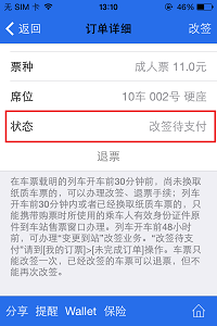 注:如未点第二步的确认改签,则会显示:改签待支付,需要在[未完成订单]内支付完成改签,否则30分钟后,车票就自动取消了。如图: