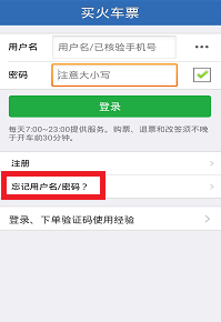 用手机打开买火车票APP点右上方登陆,再点忘记用户名/密码?随即转入中国铁路客户服务中心界面,与电脑操作是一样的,如图:
