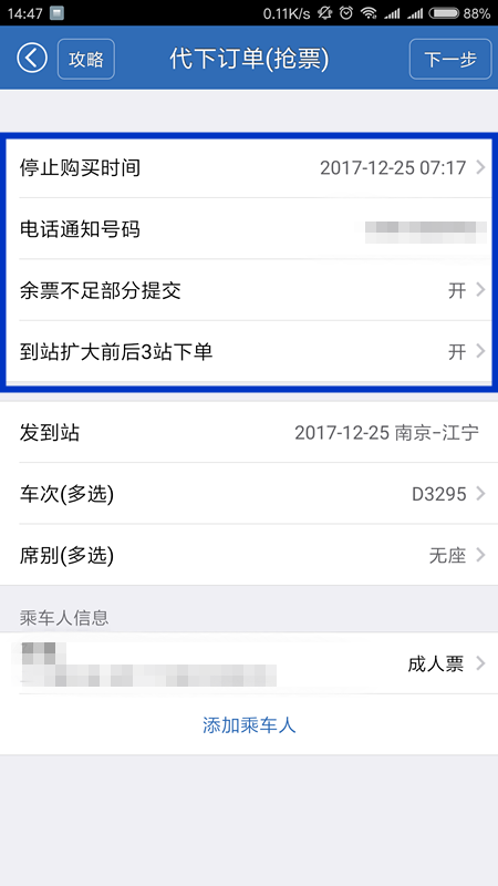 车次、席别的多选:针对一个订单多张车票的托管,打开此功能后,出发车次、席别均可单选、多选或全选。这是最重要的步骤。也是很多用户咨询的操作问题。