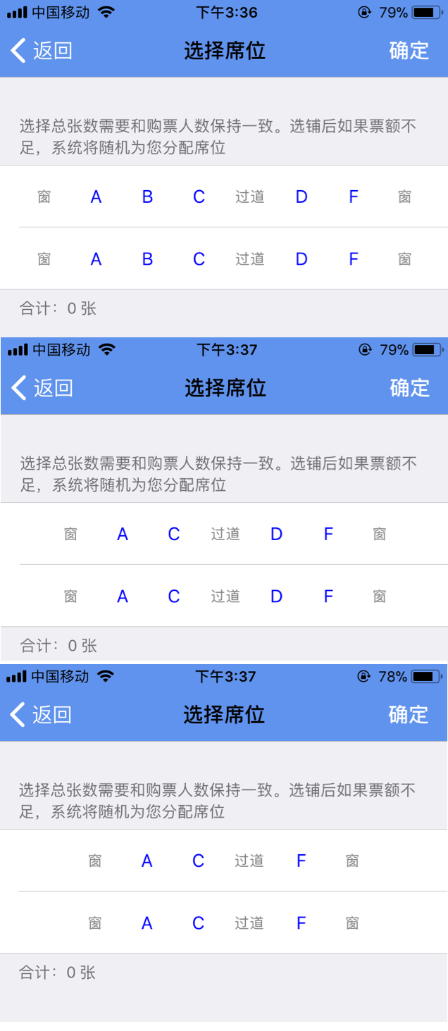二等座可选择座席:A、B、C、D、F一等座可选择座席:A、C、D、F
