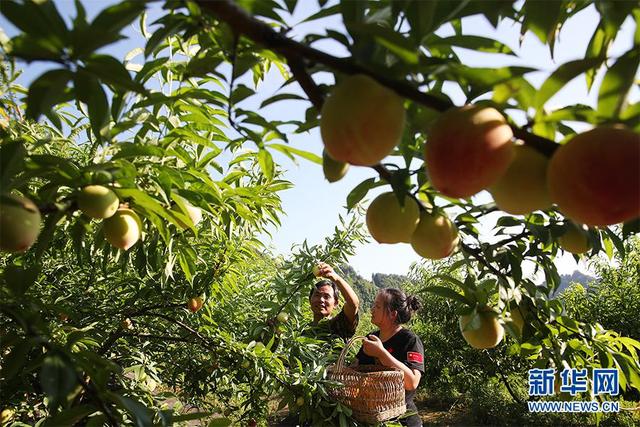 重庆市黔江区黑溪镇苏维村村民庞春武正在采摘桃子。新华网发(杨敏 摄)